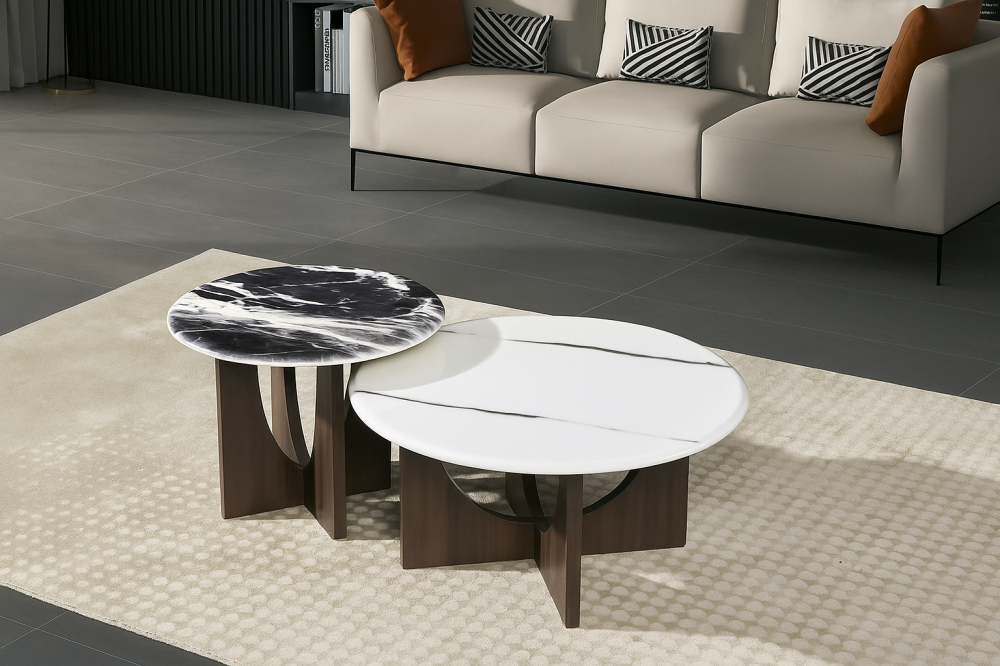 تتميز طاولة القهوة الدائرية المتداخلة بأنها تتكوّن من طاولتين بتصميم متناغم يمكن استخدامهما معًا أو بشكل منفصل حسب الحاجة، ما يجعلها مثالية للمساحات الصغيرة والمتوسطة.